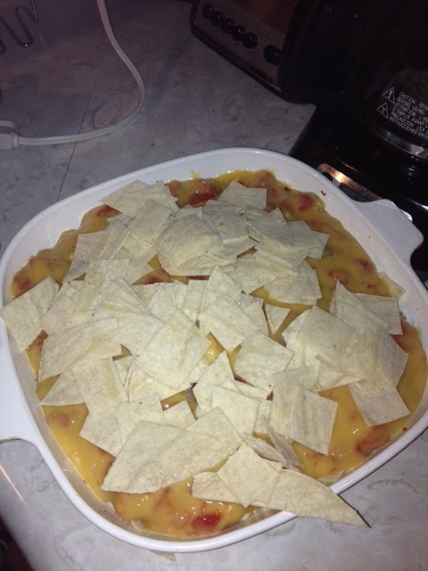 So I found this recipe on Pinterest a while back and said I was going to try it but never got a chance until….last night!! My parents took Emma to revival so I had a chance to prepare dinner and do a little bit of homework! This recipe is the Chicken Tortilla Bake with 5 ingredients: Corn tortillas, chicken, cream of chicken, rotel, cheese. Very easy to make!