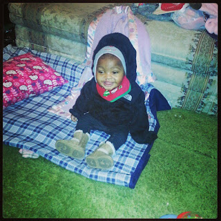 Before we left we prepped the house as if Santa had been there already, so we sat everything out and on the way out we covered Emma up with a blanket so she couldnt see…