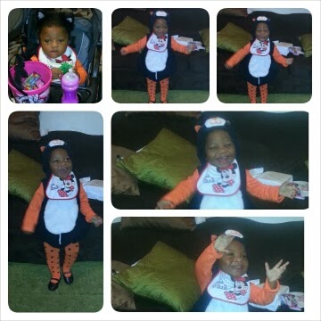 Emma and I went to my sisters job (Progressive) for Trick or Treating during the day! It was great it was from 11:30-1:00! The employees at Progressive do a GREAT job of providing candy for the kids in a safe environment. I pushed Emma around in her stroller and let her get candy, she got carried around to come desk, then she even crawled! My sister invited Emma and I, and her friend Felicia and her two youngest children.