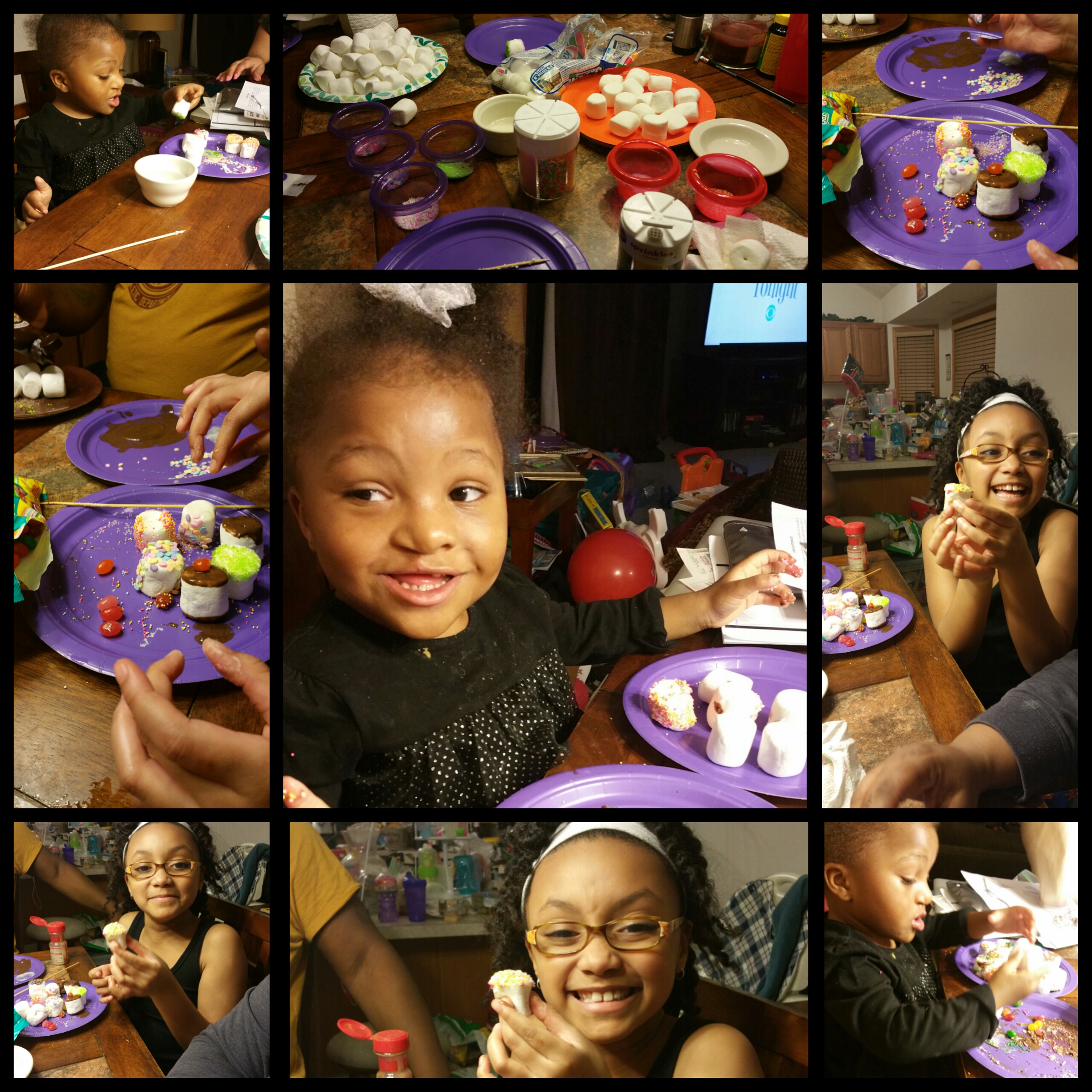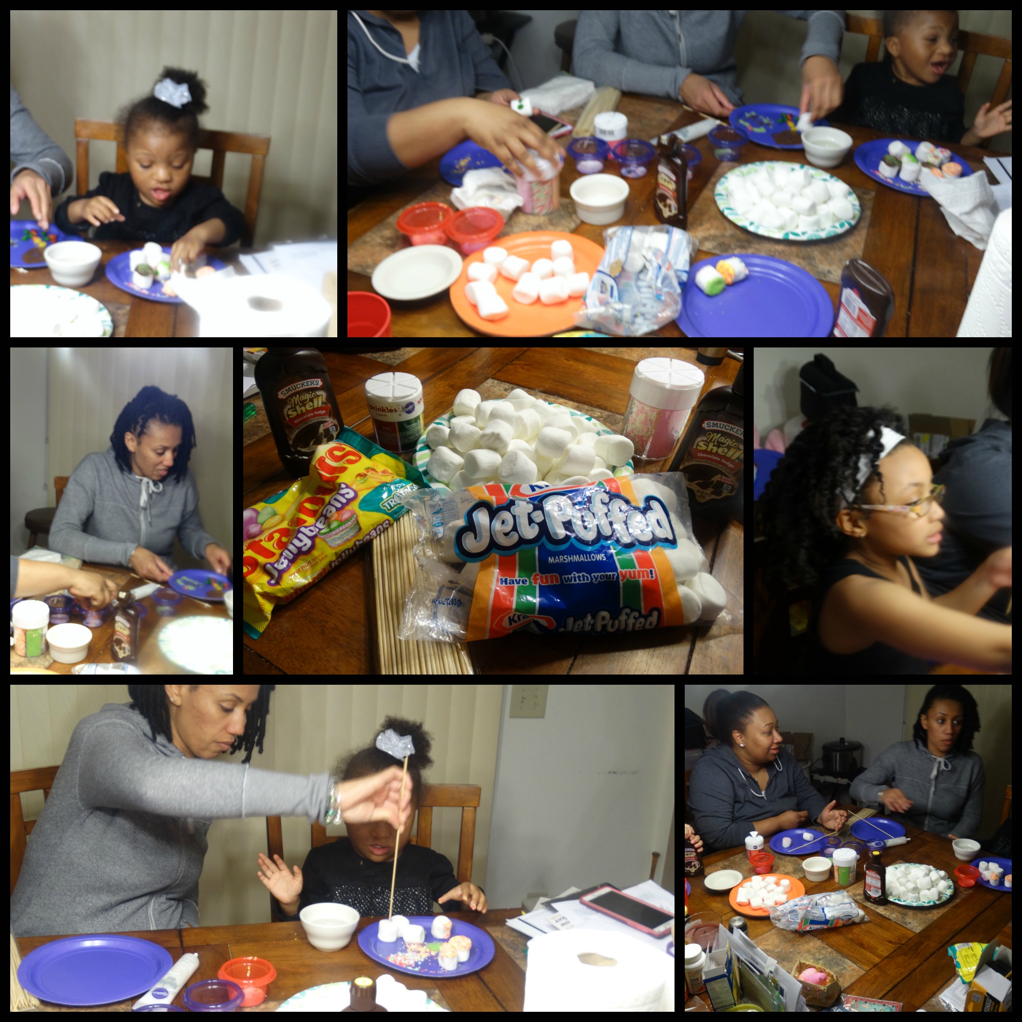 My niece loves doing arts and crafts so I explained to my sister what I was planning on doing with the girls (Emma and Solana-My Niece) and they were game. Thursday night before the holiday we sat around the kitchen table and I explained what I saw and we started the process of decorating marshmallows…