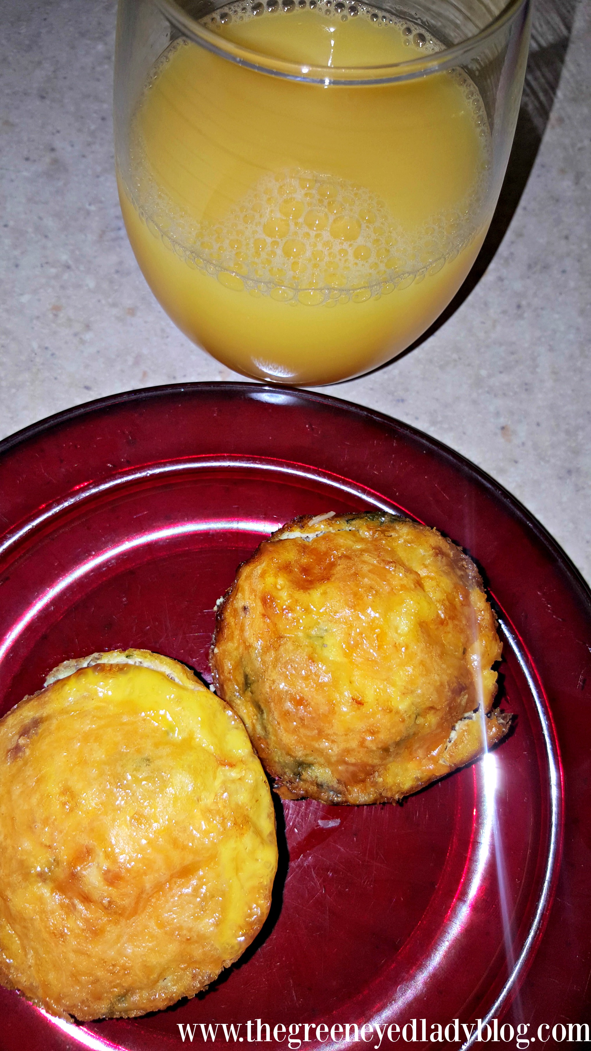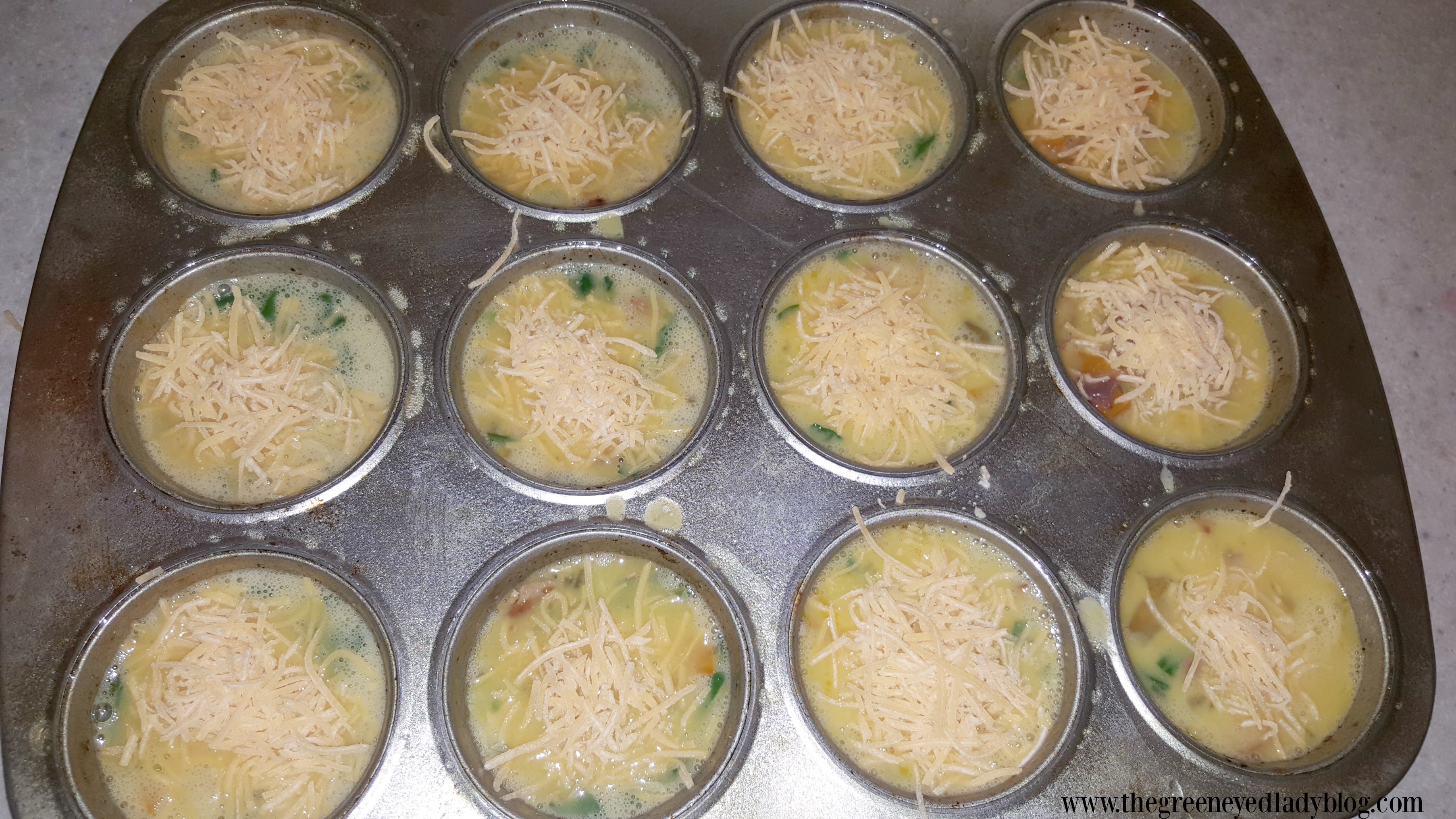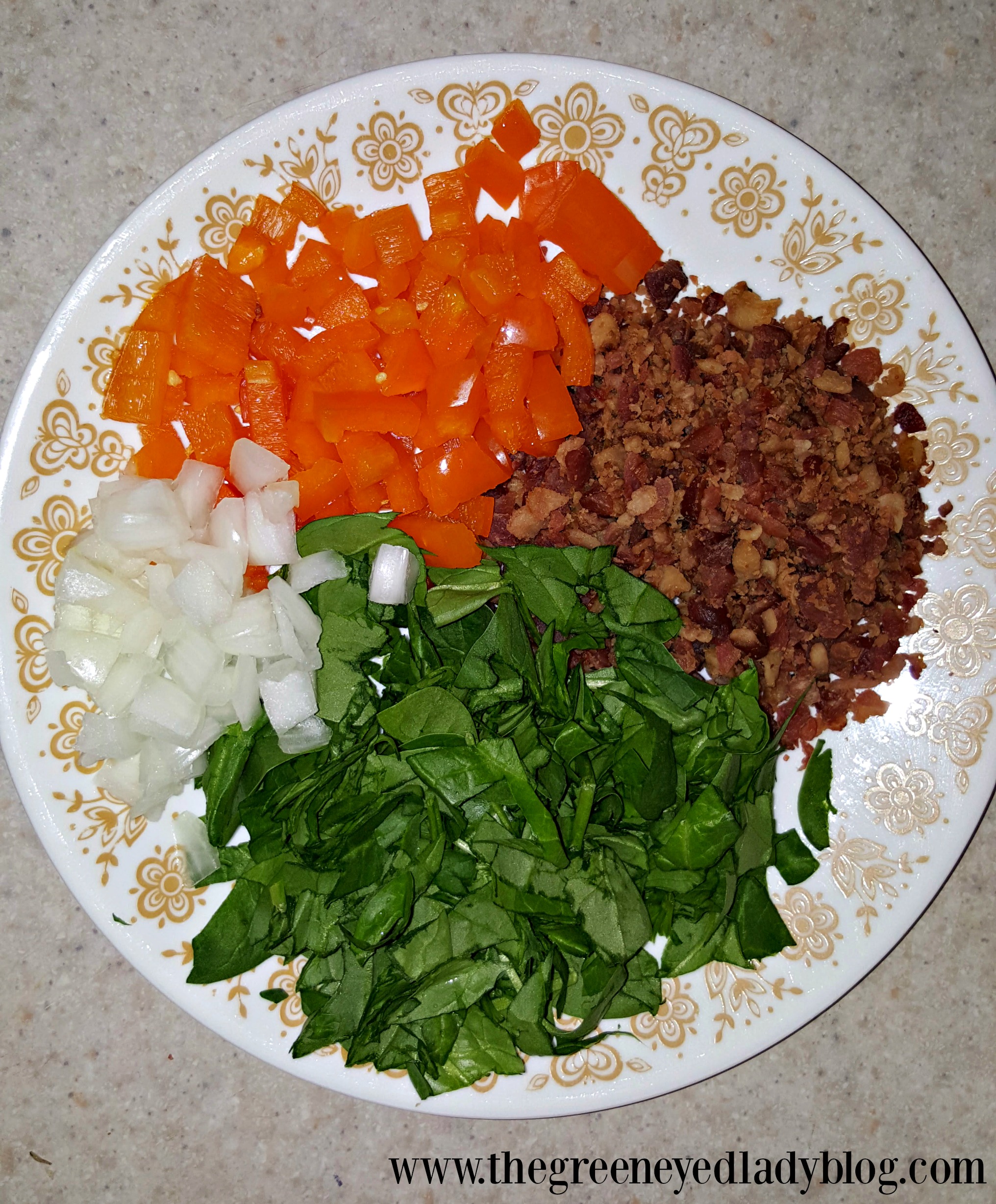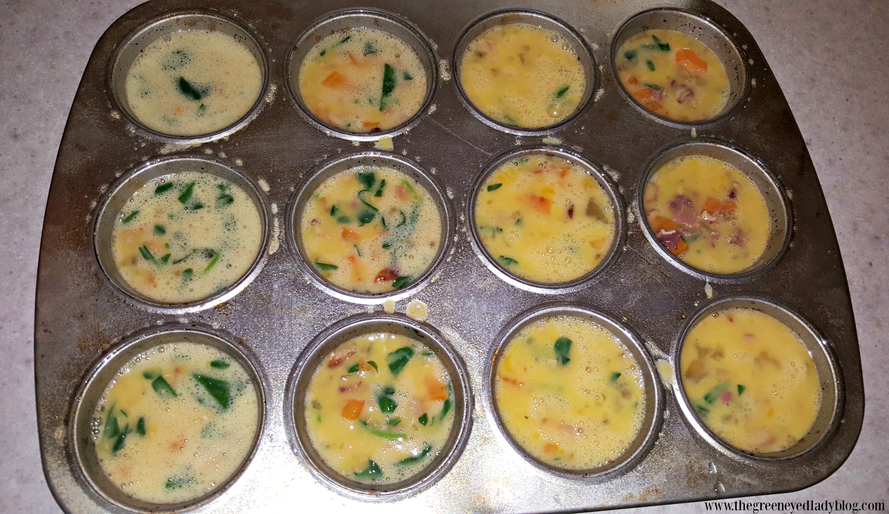 We had Spinach, Onions, Orange Bell Peppers and Real Bacon Bits…so I went with this combination, however, I was checking out Pinterest and there so many combination of veggies you can make these with.