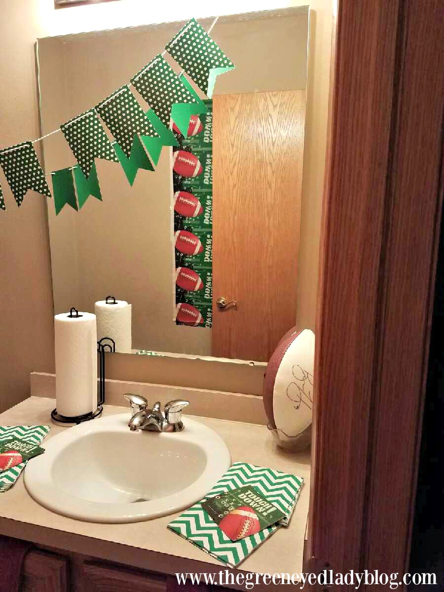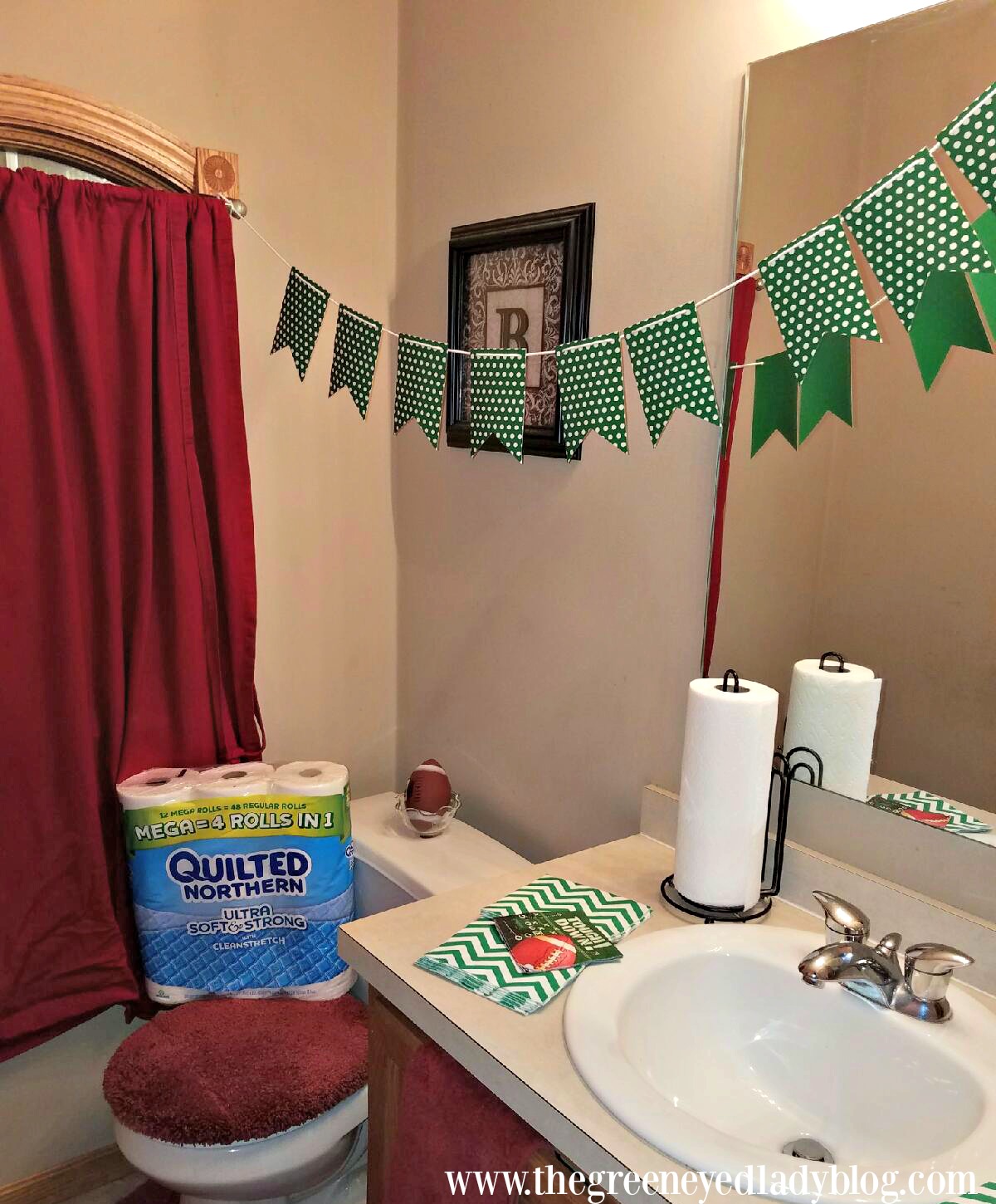 Since “my team” isn’t in the BIG GAME. I picked the color green to decorate with because of the football field! I picked up a couple of party banners to hang up in the bathroom