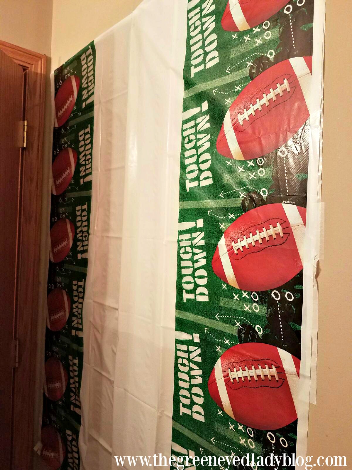 I was able to create Selfie Backdrop with a tablecloth/table cover. In the potpourri dishes I added footballs from around the house to add some extra decoration.